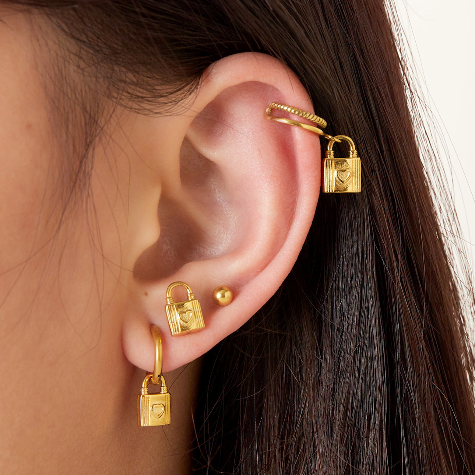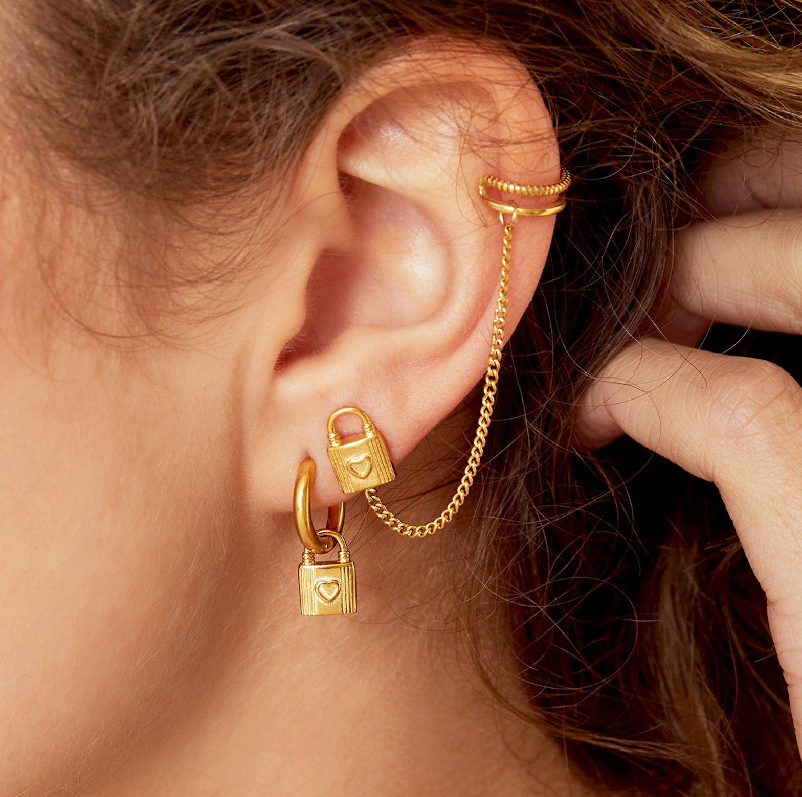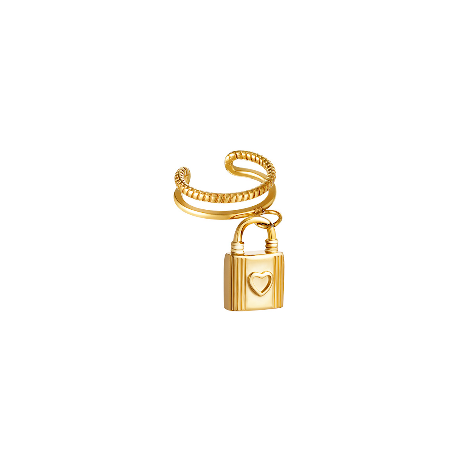 kr. 115,00A very stylish stainless steel ear cuff with little chain that is connected to an ear stud with a lock shaped charm. This earring is really adorable and so unique! The earring is available in golden-colored stainless steel. Color:Gold Material: Stainless Steel Weight: 1g Dimensions: 6.80cm x 1.20cm x 0